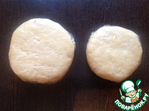 Готовое тесто разделить на 2 неравные части (одна часть должна быть чуть больше второй). Сформировать 2 диска, завернуть в пищевую плёнку и убрать в холодильник на 30 минут.