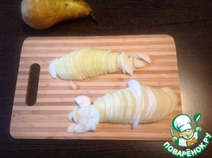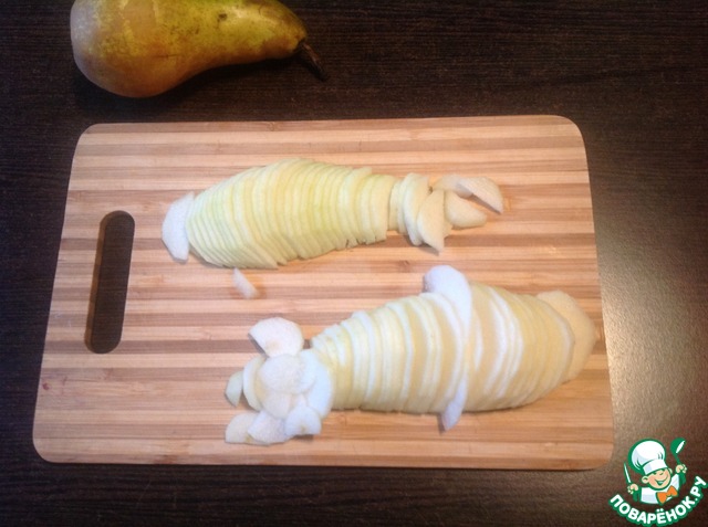 Пока тесто охлаждается, приготовим начинку. Груши вымыть, очистить, нарезать тонкими ломтиками.