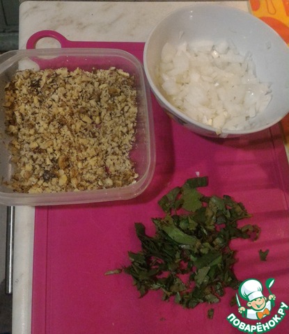 Мелко нарезаем лук, кинзу и измельчаем грецкие орехи (чем мельче, тем лучше).