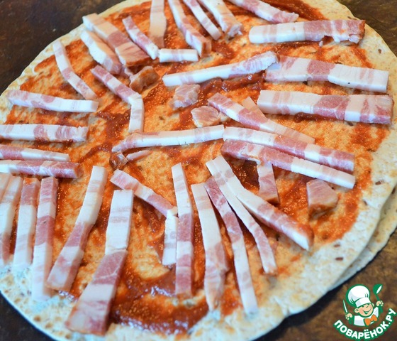 Грудинку нарезать брусочками, разложить по всей лепешке. -
