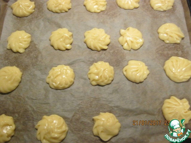 Выложить его в мешок со звездчатой насадкой и на расстоянии друг от друга отсадить на застеленные пергаментом противень круглые заготовки.