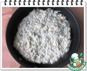 В миску отправляем творожный сыр типа "Альмете", тертый полутвердый сыр типа "Российского", яйцо, измельченную зелень (у меня - укроп), кашицу из чеснока и соль.