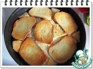 Форму диаметром 20-22 см хорошо смазываем холодным сливочным маслом и укладываем ломтики хлеба, пустые места между ломтиками заполняем мелкими кусочками хлеба.
