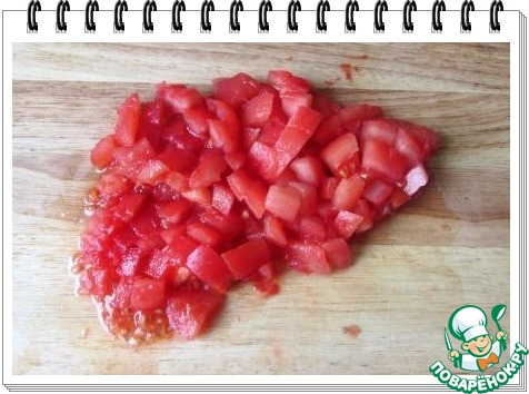 Помидоры заливаем кипятком на 30-40 секунд, обдаём холодной водой. С помидоров снимаем кожицу, вырезаем плодоножку и нарезаем мелким кубиком. -