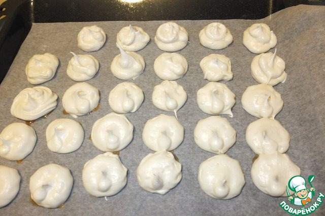 Массу кладем в кондитерский мешок и отсаживаем на противень, застеленный пекарской бумагой безешки. Ставим в духовку, разогретую до 120 градусов примерно на час.