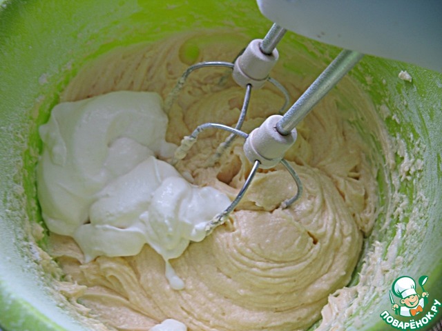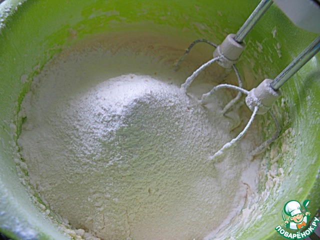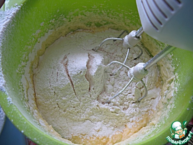 Добавить половину муки, просеянной с содой, солью и разрыхлителем, размешать.