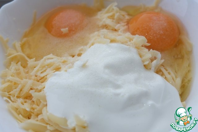 Для начинки натираем сыр на крупной терке. Добавляем яйца и сметану. Перемешиваем.