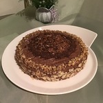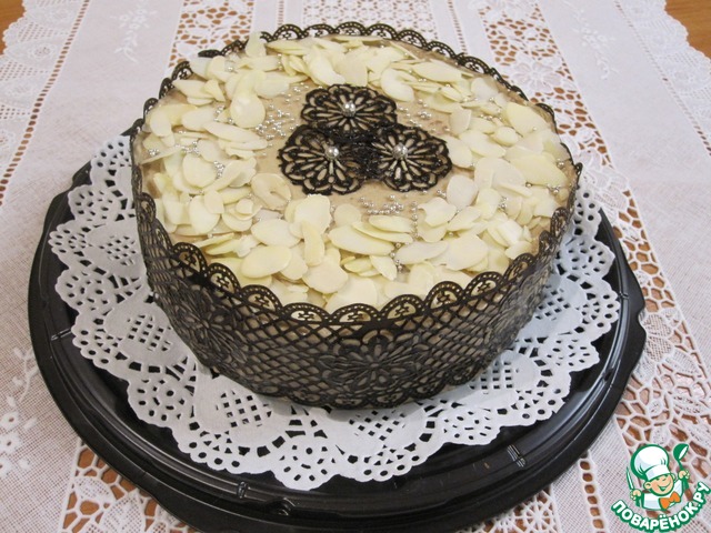 Торт украсить по вкусу. В качестве украшения использовался обжаренный орех фундук, миндальные лепестки. Шоколадные листья приготовлены из смеси белого и темного шоколада.