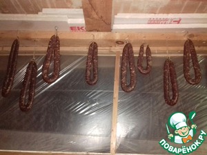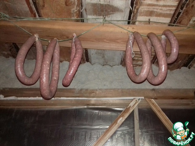Подвешиваем нашу колбасу в сухом прохладном месте. Температурный режим необходимо соблюдать, для сыро-вяленой колбасы это от +3 до +10 градусов максимум. Я начинаю делать суджук осенью, в начале ноября, и делаю весной, а вот зимой только если погода позволяет, пыталась вялить в холодильнике, не вышло, выбросили, поэтому лето тоже отпадает