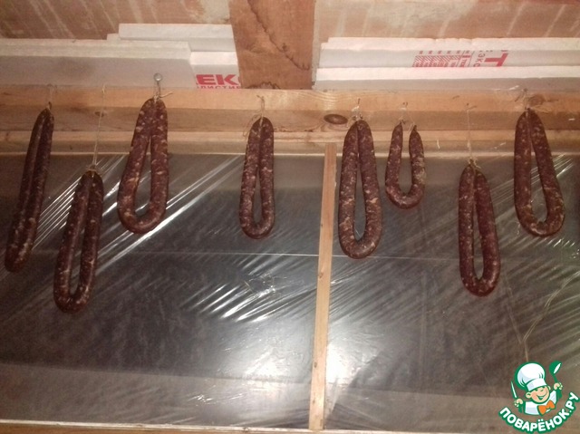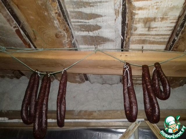 Извините за фото, делала я их тогда на телефон и вовсе не для поварят, хорошо что сохранились. И ещё... Я вялю колбасу в неотапливаемой, никак недоделанной веранде, запах стоит такой, что хочется попробовать её уже на второй день