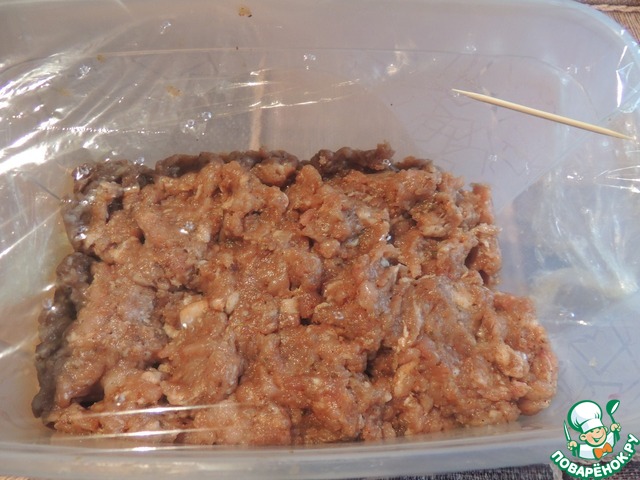 Все смешиваем, накрываем пищевой пленкой, делаем дырочки зубочисткой и убираем в холодильник созревать. Минимум на сутки, у меня зрело мяско 5 дней, временами достаем, перемешиваем и обратно в холодильник под плёночку.