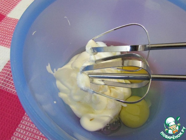 В миске соединить майонез, яйца и сахар. Взбить венчиком до однородности.
