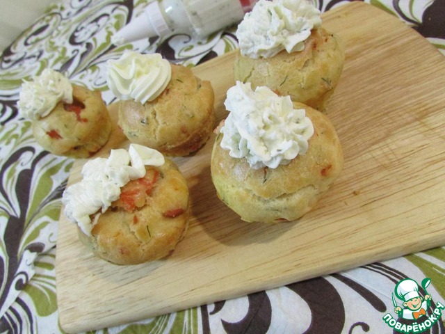 Маффины извлечь из формы, дать остыть и украсить сливочным сыром и красной икрой (но этого можно не делать, они и так очень вкусные).