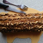 Сверните корж в рулет и уже готовый рулет промажьте сгущенкой и щедро посыпьте жаренным арахисом.