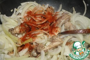 Сначала обжариваем курицу до легкой золотистости, потом добавляем лук и паприку, у меня одна острая, а другая - сладкая. Обжариваем все около 7 минут.