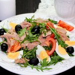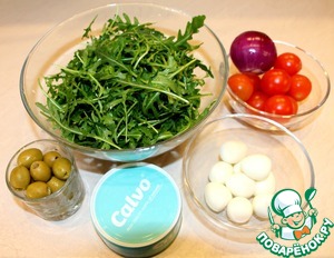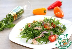 Салат сложился после просмотра сериала "Кухня". Сочетание вкусов пикантной рукколы и нежного тунца превосходно оттеняется маринованным луком и оливками. Перепелиные яйца добавляют салату сытость, а помидоры черри хороши в любом блюде.