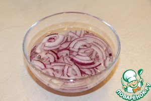 Лук предварительно замариновать на 15-20 минут. Для маринада смешать воду, винный уксус и сахар.