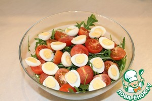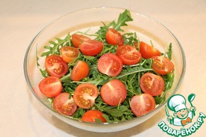 Рукколу выложить в большой салатник, черри порезать пополам и добавить к рукколе.