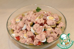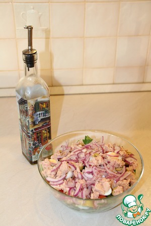 Вытащить лук из маринада и выложить сверху. Заправить салат оливковым маслом, приправить солью и немного перемешать. Если тунец в масле, количество оливкового масла для заправки уменьшить.