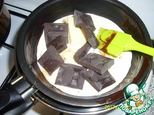 По прошествии некоторого времени примерно двух часов, когда крем на основе пудинга почти застыл, я приготовила глазурь. На водяной бане растопила 100 гр. сливочного масла, потом к нему добавила 100 мл. сливок 10%, 3 ст. л. сахара и 100 гр. темного шоколада.