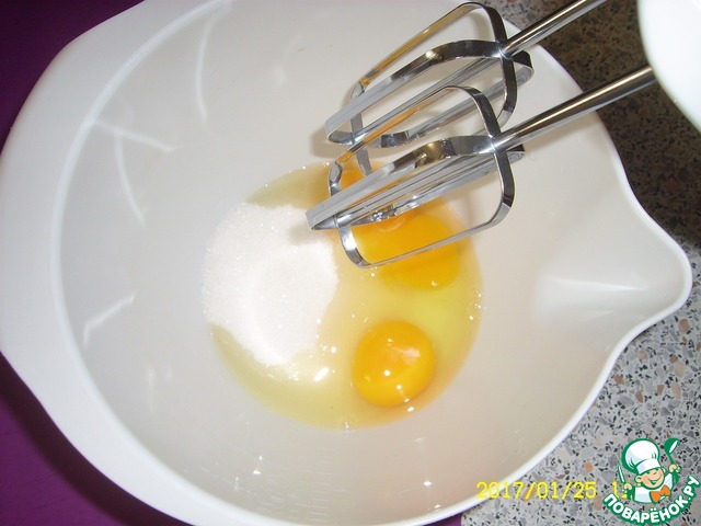 В глубокую миску я вбила два яйца и всыпала один стакан сахарного песка.