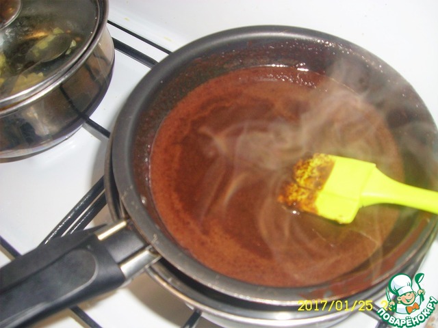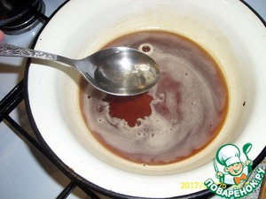Пока мой пряник-коржик отдыхал, я сварила сироп для его пропитки. В миску влила 100 мл. питьевой воды и всыпала 2 ст. ложки сахара, нагрела на среднем огне, когда сахар растворился всыпала 1 ст. л. растворимого кофе.