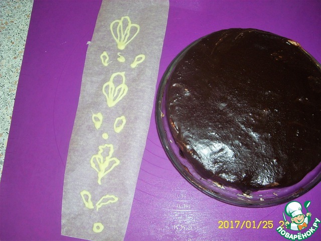Растопив так же на водяной бане шоколад прямо в корнетике я нарисовала на куске пергамента вот такие канделябры))) Насколько хватило у меня умения и фантазии))) Затем так же вынесла на балкон застывать. На фото уже застывшие торт и канделябры из белого шоколада.