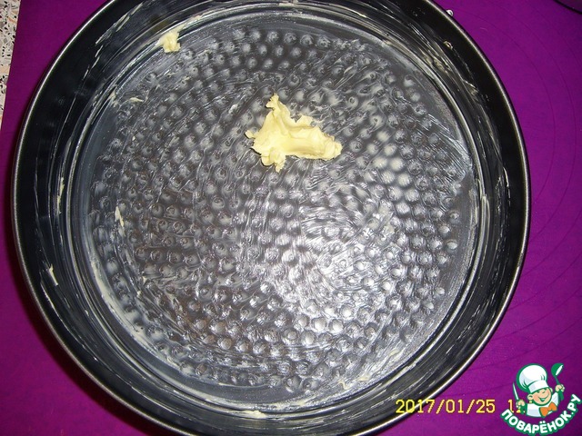 Подготовила разъемную форму размером 24 см. для выпекания коржей: сначала смазала ее кусочком сливочного масла примерно 50 гр.