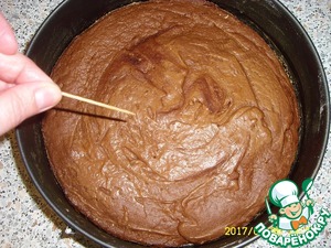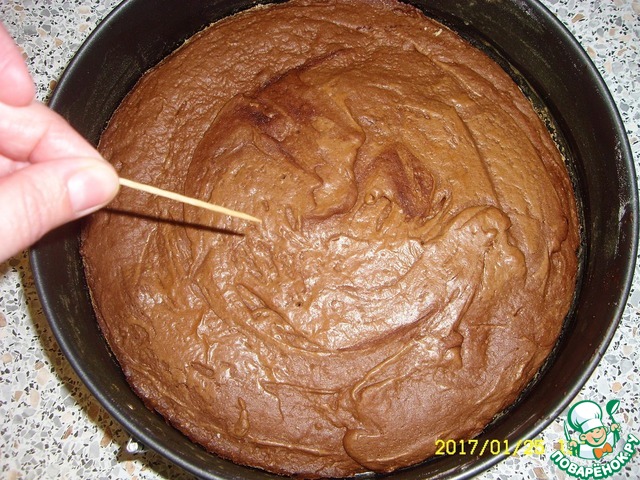 Шоколадный корж я обрезала по размеру моей старой формы 22 см в диаметре. Ну не люблю я сухие края коржей))). Форму без дна поместила на блюдо и в нее корж. Проколола корж часто вилкой и пропитала кофейным сиропом.