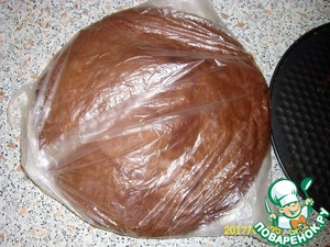Корж получился как большой круглый шоколадный пряник)). Но это и было моей целью. Именно не мягкий пышный, а суховатый и хорошо держащий форму корж. Корж я сначала остудила немного и еще слегка теплым убрала в пакет "созревать". Начитавшись блогов профессионалов я поняла, что это действительно работает!