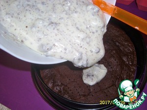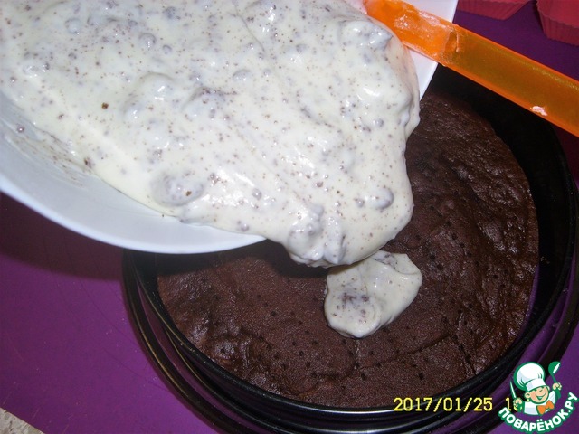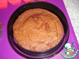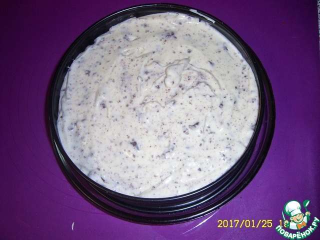 Всю эту массу с крошками я вылила в кольцо на уже пропитавшийся корж.