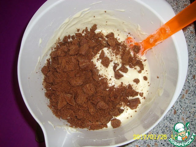 Будучи экономной хозяйкой я не оставила в стороне обрезки от коржа))). Измельчив их ножом и руками как можно мельче и быстрее, дабы крем мой не застыл совсем, я закинула их в ванильную ароматную массу.