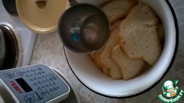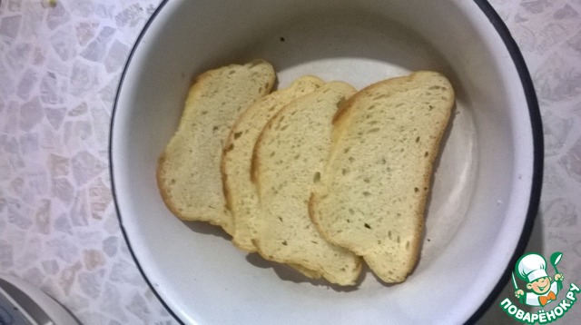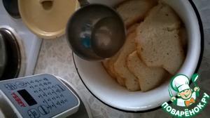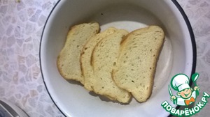 Ломтики батона полить бульоном, в котором варилась курица, до мягкости