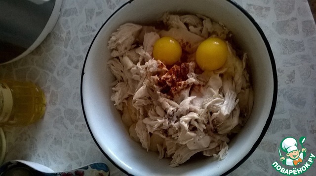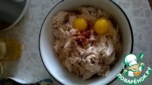 В миску добавить куриное мясо, яйца, соль, перец