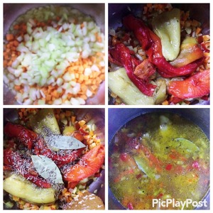 Добавляем морковь и сельдерей, снова обжариваем минут 5-6. Отправляем в кастрюлю перцы, чайную ложку кумина и два лавровых листика. Заливаем куриным или грибным бульоном (если нет бульона, тогда просто кипятком). Бульона нужно столько, чтобы просто прикрыть овощи. Варим суп до того, пока морковь не станет мягкой.