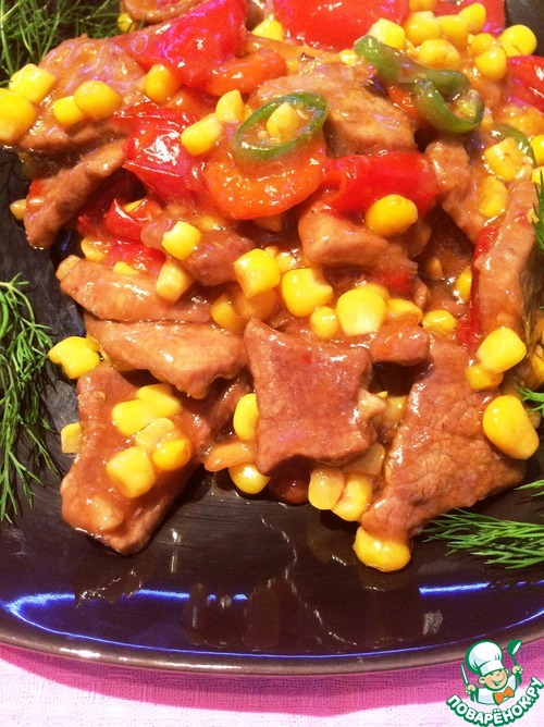 Мясо в кисло-сладком соусе с сахарной кукурузой. Очень мне нравится мясо в кисло-сладком соусе, причем как куриное, свиное, так и говядина. Решила поделиться рецептом, вдруг кому пригодится. Ужин получается отличный. На этот раз я готовила из говядины.