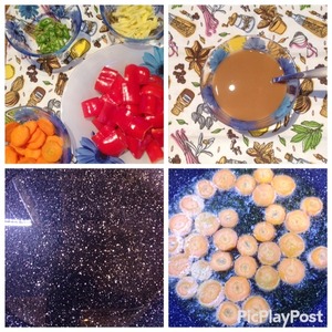 Пока мясо маринуется, займемся овощами. Стараемся нарезать перец и морковь такими же пластинами, как и мясо.