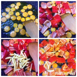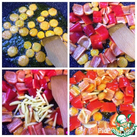 Добавляем к моркови перец и имбирь, обжариваем до мягкости перца.