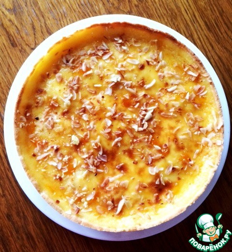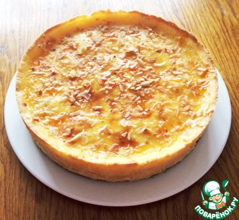 Джем подогреть, аккуратно намазать пирог и сверху обсыпать миндальными лепестками, обжаренными на сухой сковороде.
