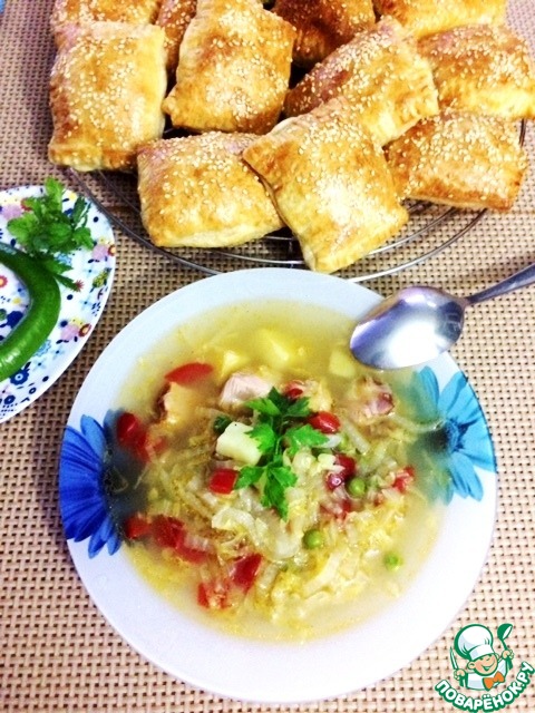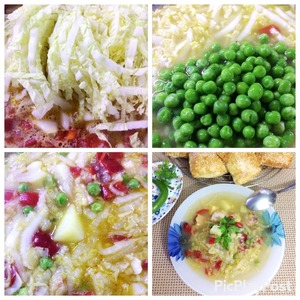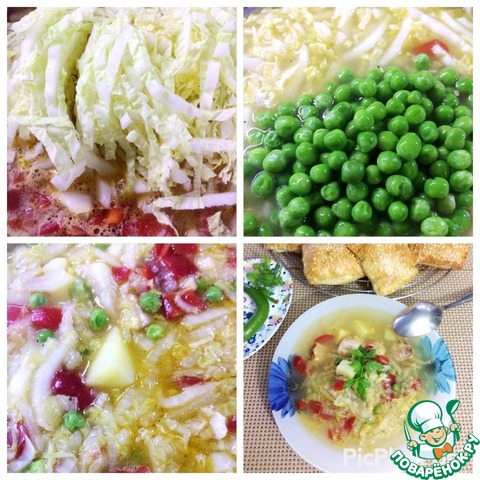 Предлагаю вариант вкусного супчика к обеду. Копченная свиная грудинка, в сочетании с куриным бульоном, нежной пекинской капустой, зеленый горошек и немного красного болгарского перца - получается красочная тарелочка. Угощайтесь - это вкусно!!!