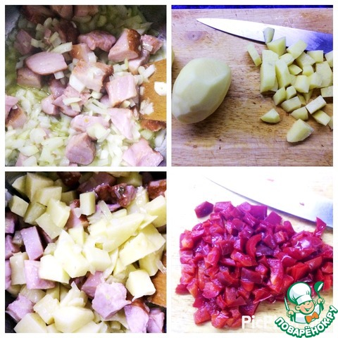 У меня копченная свиная грудинка была в наличии. Нарезаем кубиками, достаточно крупными. В кастрюлю наливаем оливковое масло, добавляем сливочное. Отправляем в кастрюлю нарезанное мясо, обжариваем его минут 5-6.