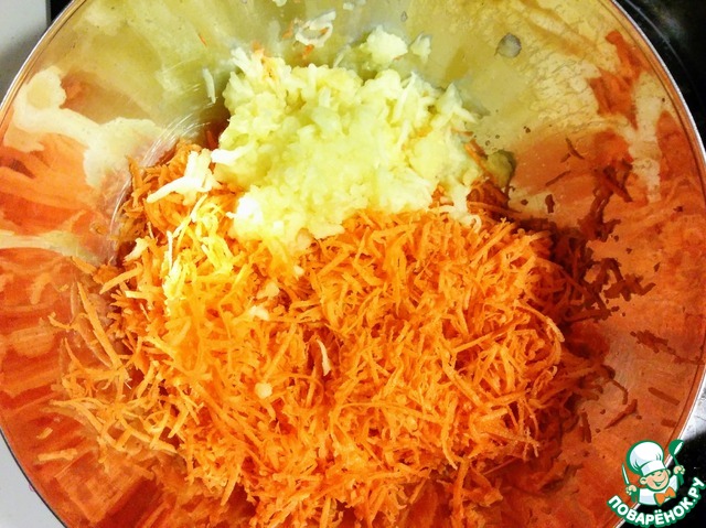 Натираем на мелкой терке морковь и яблоко
