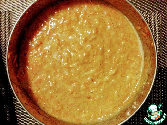 Постепенно тоненькой струйкой вливаем растительное масло. Добавляем тертые морковку, яблоко. В отдельной миске смешиваем муку, щепотку соли, пекарский порошок, корицу и соединяем все ингредиенты.