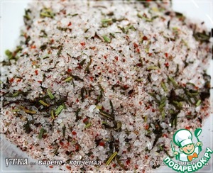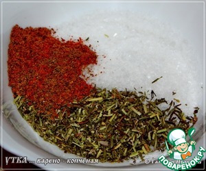 Для засолки мяса, я приготовил вот такую смесь. Чайную ложку крупной соли на кило утятины – это раз, смесь травок. Там тимьян, орегано, розмарин. И смесь перцев. Паприка, черный, белый душистый, немного острого красного. Эти приправки и специи, их количество и набор – по вкусу.