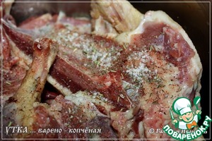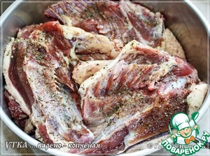 Потом каждый кусок утятины обсыпать этой смесью и слегка даже, не побоюсь этого слова, помассировать. Не то чтобы сильно втирая смесь засолочную, а скорее распределяя равномерно. Но без фанатизма.