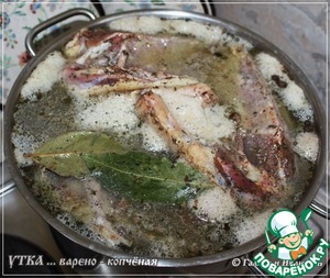 Опять же – продолжительность процесса. Где-то рекомендуют довести до кипения и снять кастрюля с огня. Где-то советую поварить минут от пятнадцати до получаса. Я дал побулькать минут двадцать. Все-таки первый опыт и как пройдет копчение мяса, еще не знаю.