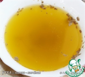 Источники смысл этого процесса однозначно объясняют тем, что надо выварить подкожный жир из птичкиных частей. Тут я согласен. Посмотрите, какой, так сказать, бульон получился в результате. Насыщенность его весьма и весьма впечатляет.