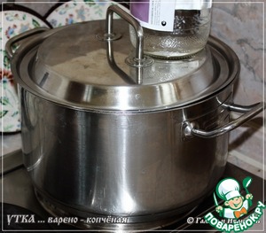 Снимаем кастрюлю с огня и ставим охлаждаться. Мне пришлось сверху груз поставить, чтобы утка не вылезала наружу.