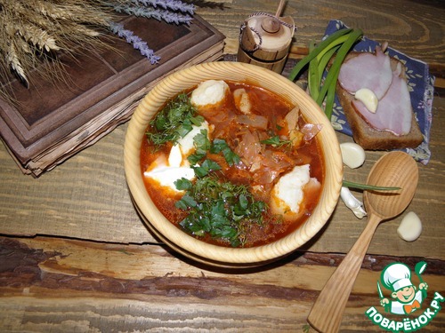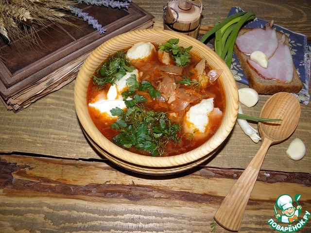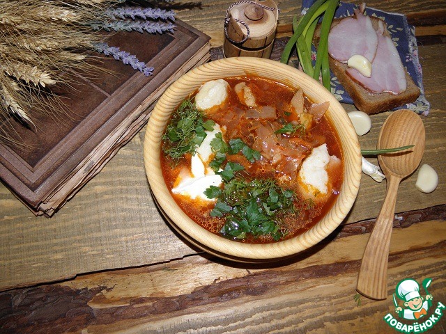 Заправить борщ сметаной, посыпать нарезанной зеленью по вкусу, отдельно подать чеснок, пампушки или хлеб