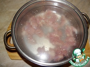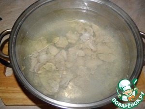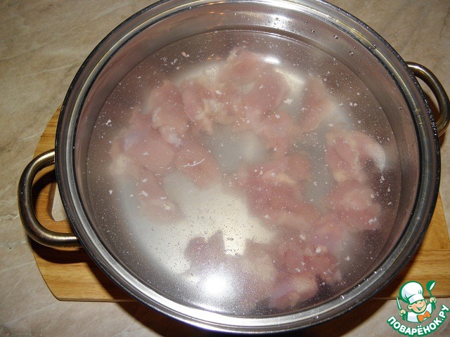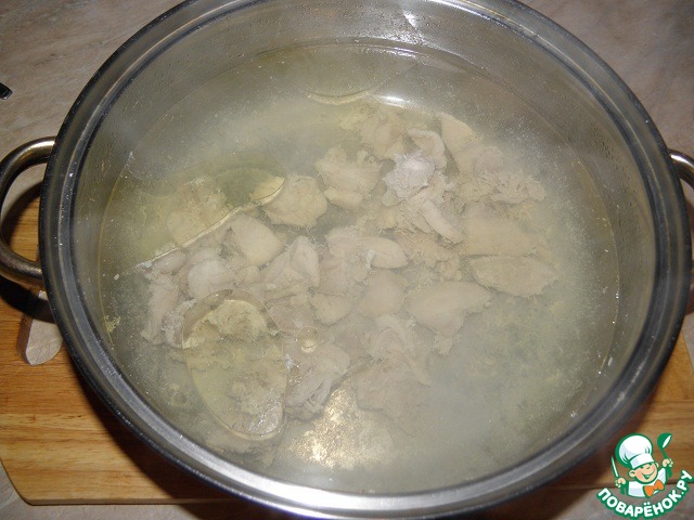 Подготовим мясо: Промоем, нарежем кусками в районе 5см, зальем водой чтобы оно было покрыто примерно выше на 15см. Ставим варить бульон, в среднем от 40 до 60 минут (в зависимости от вашего мяса)
